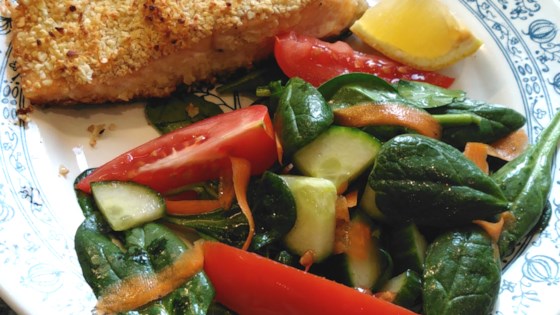Place spinach and tomatoes in a bowl. Add dressing; toss to coat. Serve alongside the salmon.