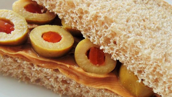 - Spread peanut butter on one slice of bread; top with green olives. Place second piece of bread atop the filling to make a sandwich.